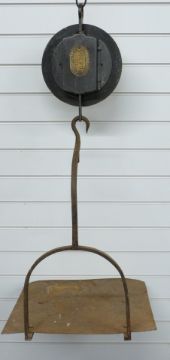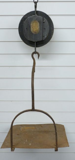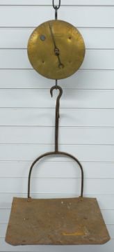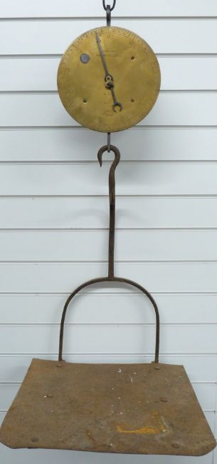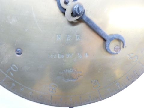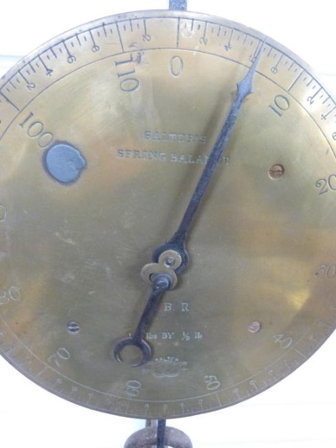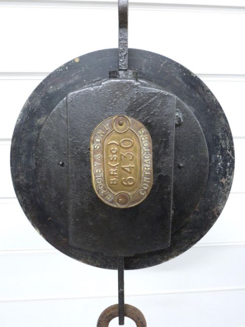 North British Railway Salter's spring balance with pan hanging below, to weigh 112lb, with NBR to dial and also with H.Pooley & Son Ld contractors BR (Sc) 6430 brass plaque verso