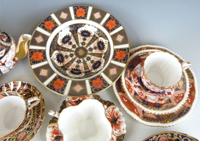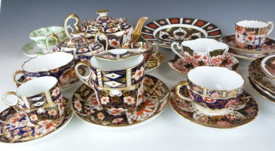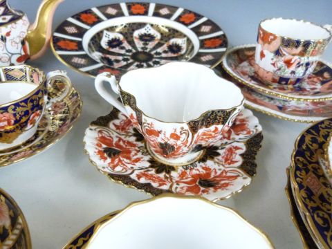 A collection of Royal Crown Derby Imari 2451 and 1128 pattern teaware, Copeland Imari teaware, Wileman/Foley (later Shelley) lobed cup and saucer, 19thC cup and saucer etc