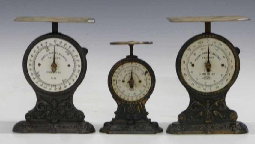 Three Salter's No 35 postal parcel balances, comprising 24oz, 7lb and 11lb examples, each with postage rates to dials and with decorative cast base and surround, largest H22cm