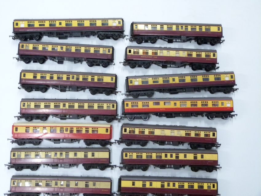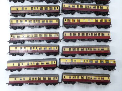 Twenty-six Tri-ang and Tri-ang Hornby 00 gauge model railway coaches in crimson and cream liveries.
