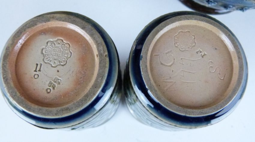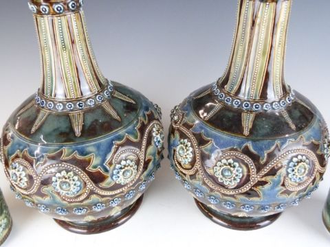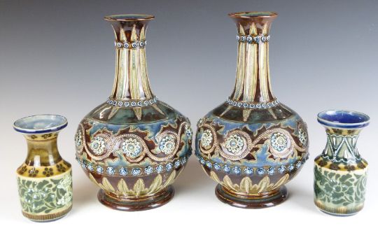 Two pairs of Doulton Lambeth vases with incised signatures, the tallest pair H24cm