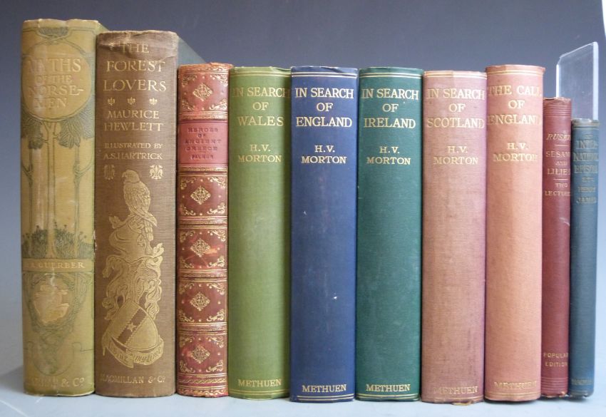 Myths of The Norsemen by H.A. Guerber 1911 in decorated cloth. The Forest Lovers by Maurice Hewlett with mounted colour plates by Hartrick 1909 gilt illustrated cloth. Heroes of Ancient Greece by Palmer 1898 bound in full leather. H.V. Morton's In Search of England, Wales, Ireland and Scotland and another. Henry James 1883 and Ruskin 1897