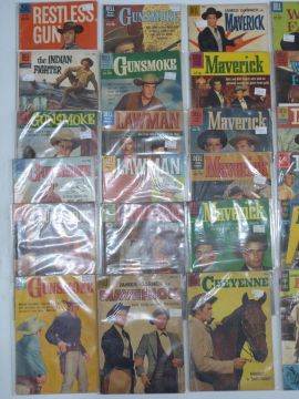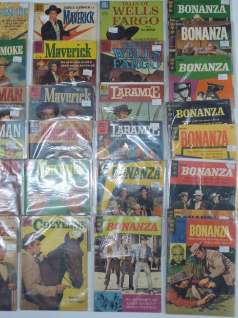 Thirty-three Dell and Gold Key TV and Western related comics including Gunsmoke, Maverick, Bonanza, Laramie etc.