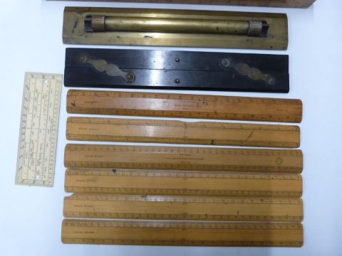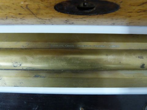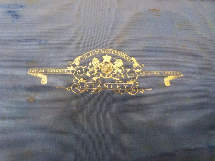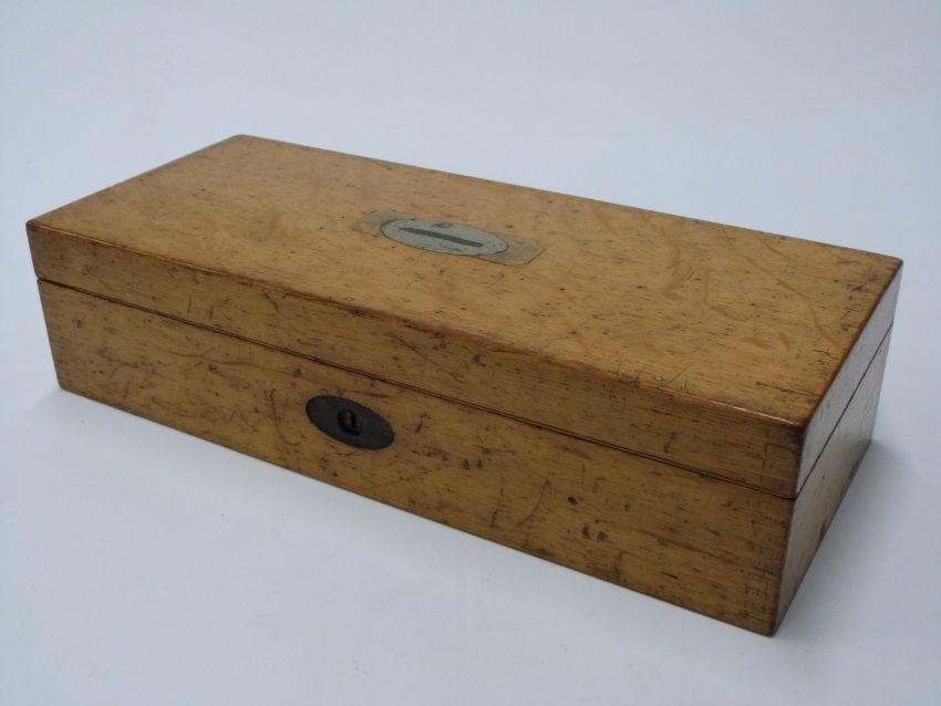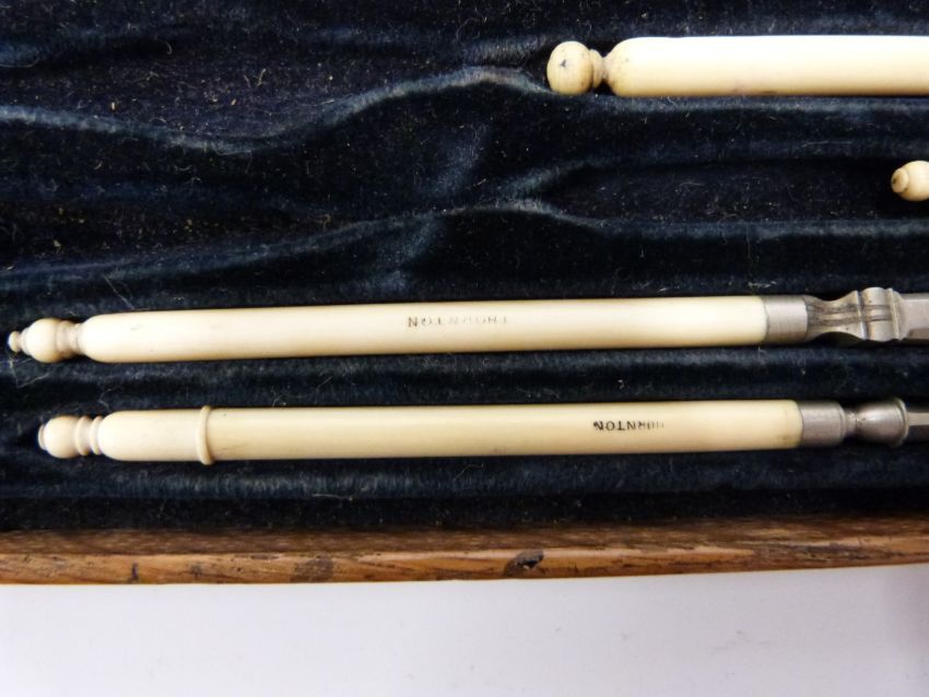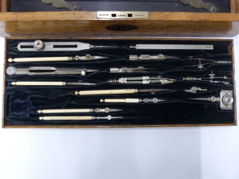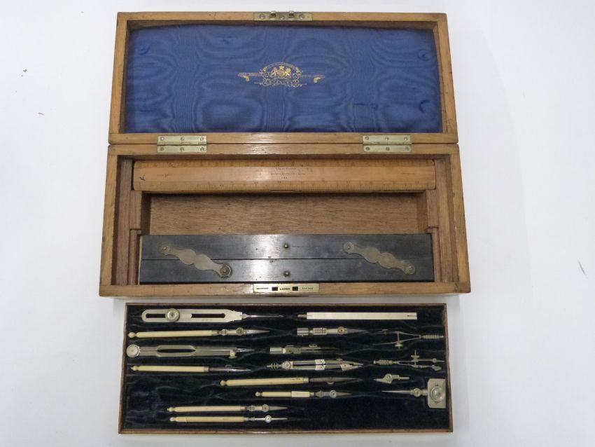 Victorian oak cased Stanley draughtman's set with lift out tray of ivory handled and other instruments, rulers etc, W 37 x D 16 x H 9cm
