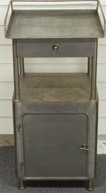 An individual style metal freestanding kitchen / workshop cupboard with drawer, shelf  and gallery top, W44 x D40 x H87cm