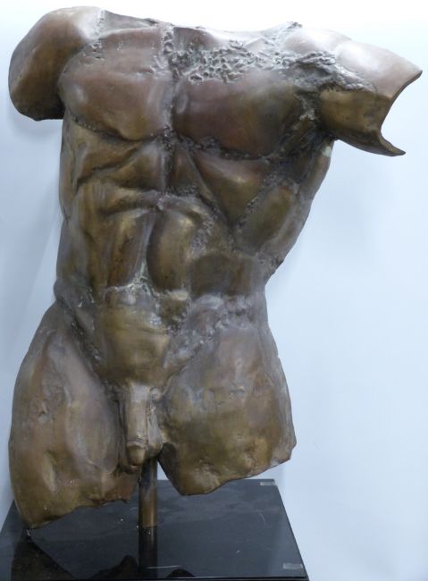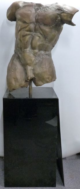 C Techoue contemporary patinated bronze male torso on square base, signed to lower left, height of bronze 83cm, total height including base 163cm