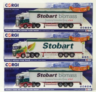 Three Corgi Hauliers of Renown Eddie Stobart 1:50 scale limited edition diecast model Scania R lorries, two Rear Tag CC13756 and one Moving CC13768, all in original boxes.