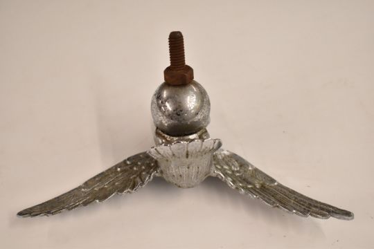 Desmo or similar vintage car mascot formed as bird on ball, width 17.5cm