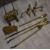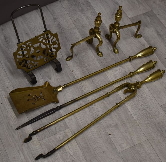 19thC brass fire irons, pair of fire dogs and a trivet