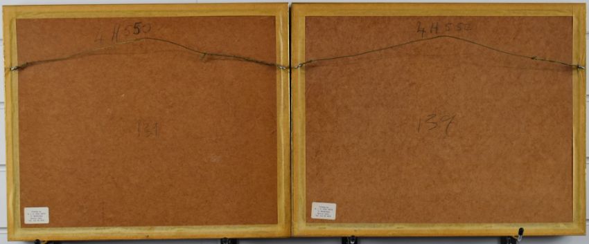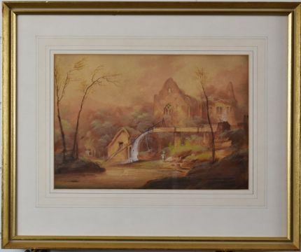 A pair of 19thC watercolours of ruins and a mill, indistinctly signed possibly F. Calvert, each 20 x 29cm, in gilt frames