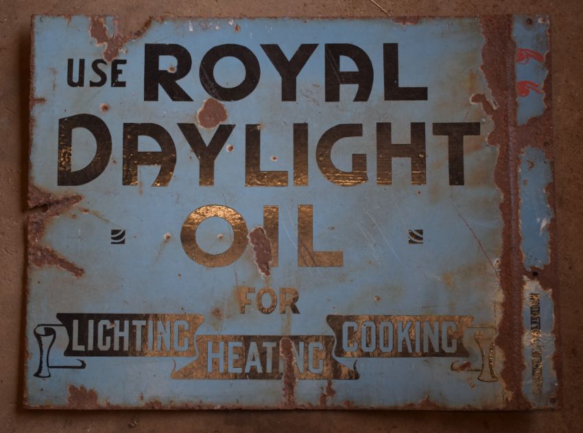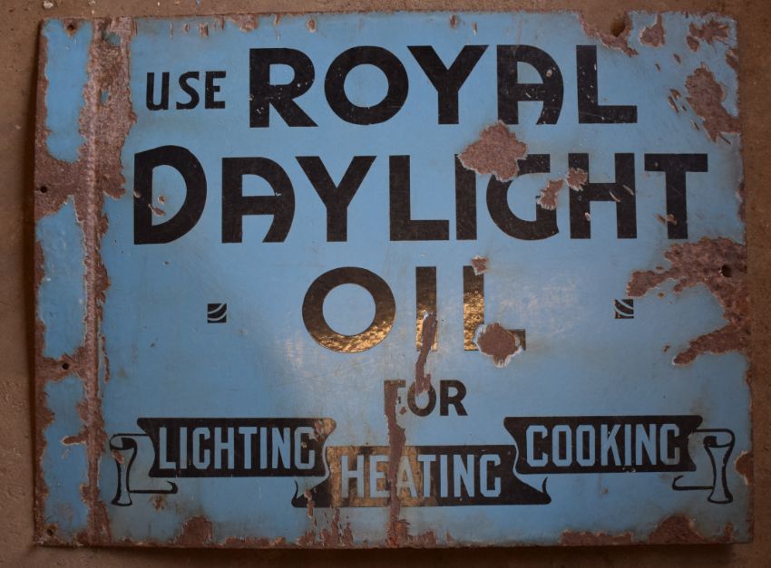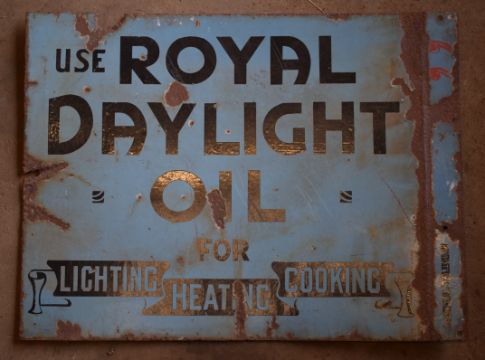 Vintage double sided enamel advertising sign 'Royal Daylight Oil', 46 x 61cmPLEASE NOTE this lot is located at and will be sold from Cocknells Farm, Moreton Valence, Gloucester GL2 7LZ. Viewing is available on Tuesday 6th July 10am to 4pm and before the sale on Saturday 10th July from 9am to 11am, no appointment is necessary but we will limit numbers if required to ensure social distancing is observedWe are not able to offer our usual postage service for this lot