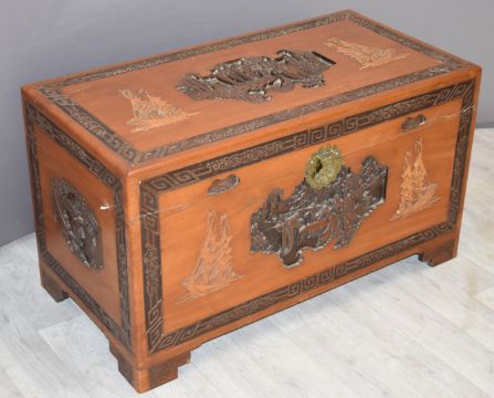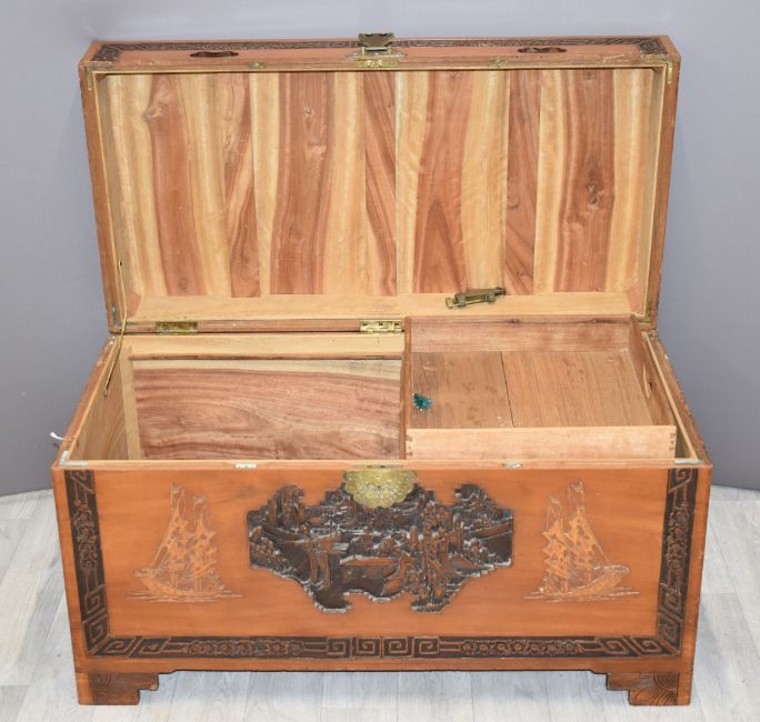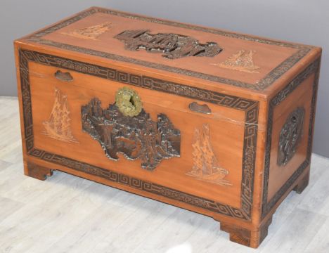 Carved Chinese blanket box with two trays inside, W102 x D53 x H57cm