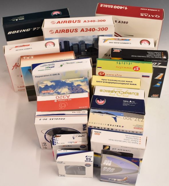 Twenty 1:400 scale diecast model aircraft, various manufacturers and liveries including China Eastern Airbus A320-200, United Airlines 737-300 and PIA Boeing 777-200ER, all in original boxes.