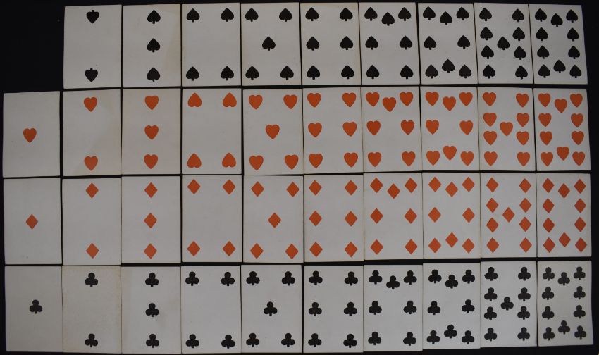 Bancks Brothers successors to Hunt & Sons pack of playing cards with old frizzle ace, single ended court cards and pink backs (47 cards) and a further part pack with blue patterned backs (39 cards)