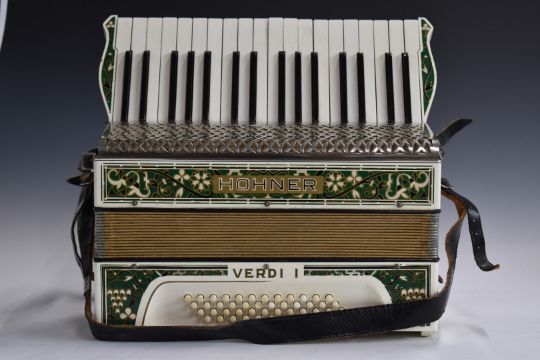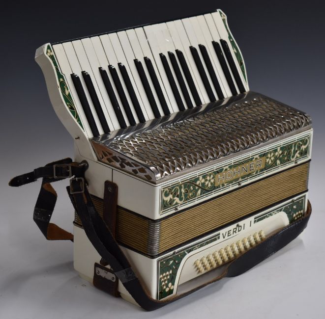 Hohner Verdi 1 c1930s 48 bass 4 x 12 configuration piano accordion in ivory coloured finish with green floral and foliate design, in original carry case