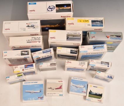 Twenty Herpa Wings diecast model aircraft in various scale sizes and carrier liveries including 511698 Hamburg International Boeing 737-700, 561853 United Embraer ERJ-170 and 552035 British Airways Dornier Do 328 Jet, all in original boxes.