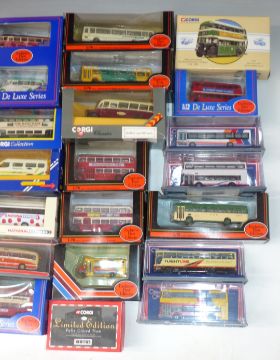 Twenty Corgi and Gilbow 1:76 scale diecast model buses including Badgerline Mini, Plaxton Premier National Express and Bristol FLF Lodekka, all in original boxes.
