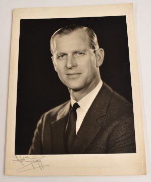 Anthony Buckley three black and white photographic portraits of HRH Prince Philip, Duke of Edinburgh, the first a head and shoulders portrait, 14.5 x 11cm, on card mount signed 'Philip' and with Anthony Buckley number 5172-4 in pencil verso; the second another larger head and shoulders portrait, 25 x 20cm, on card mount signed by the photographer, with number 4591-54 in pencil verso and the third a portrait in uniform, 25 x 20cm, on card mount signed by the photographer with number 4591-27 in pencil verso