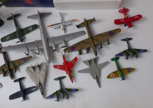 A collection of Corgi, Atlas Editions and similar diecast model vehicles including aeroplanes, James Bond Aston Martin 271 etc, some in original boxes.