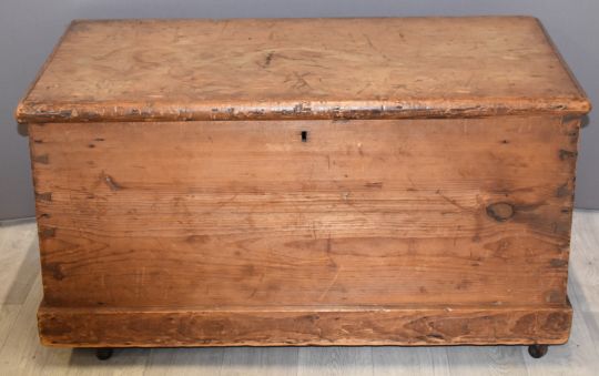 19thC pine trunk with twin drop handles on castors, W86 x D48 x H46cm