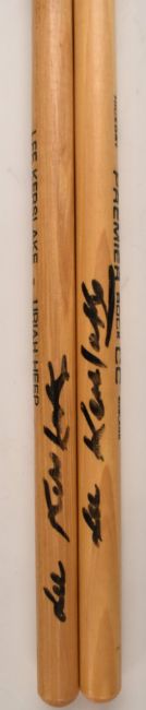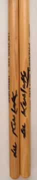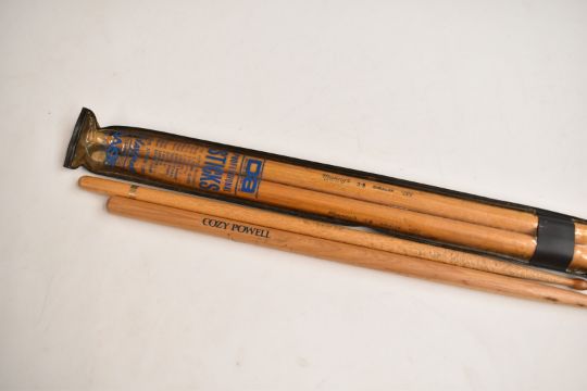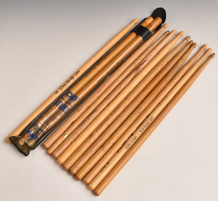 A collection of drumsticks including Cozy Powell and Dean Markley branded examples and a pair signed by Lee Kerslake of Uriah Heep