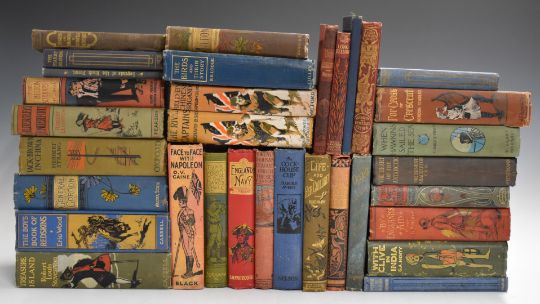 [Edwardian Illustrated Bindings] Includes Shackleton The Heart of The Antartic 1910, David Livingstone by Rev Marrat, Treasure Island by Robert Louis Stevenson, England's Navy 1899, Face to Face with Napoleon and others by Jules Verne, G.A. Henty etc  (33)