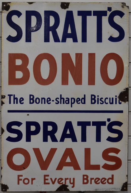 Vintage enamel advertising sign 'Spratt's Bonio, The Bone - Shaped Biscuit, Spratt's Ovals for Every Breed', 76 x 51cmPLEASE NOTE this lot is located at and will be sold from Cocknells Farm, Moreton Valence, Gloucester GL2 7LZ. Viewing is available on Tuesday 6th July 10am to 4pm and before the sale on Saturday 10th July from 9am to 11am, no appointment is necessary but we will limit numbers if required to ensure social distancing is observedWe are not able to offer our usual postage service for this lot