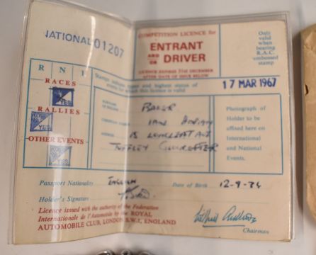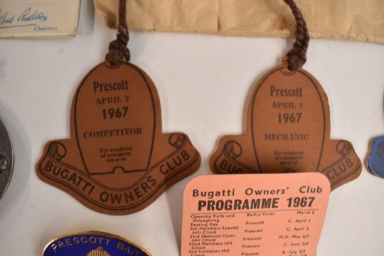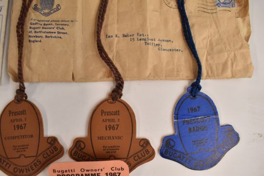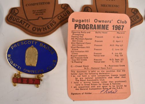 1967 Bugatti Owners Club / Prescott Hill Climb ephemera including competitor's licence, badges, AA badge etc