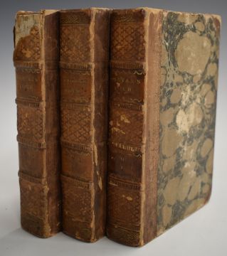 [William Combe & Rowlandson] The Tour of Doctor Syntax comprising Tour, Second Tour and Third Tour published Ackermann 1823 in 3 volumes illustrated with 80 hand coloured plates by Thomas Rowlandson (including frontispiece and the 2 engraved title pages) bound in half leather with raised bands and gilt decorated spines (some loss of leather top volume 2) (3)