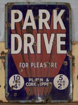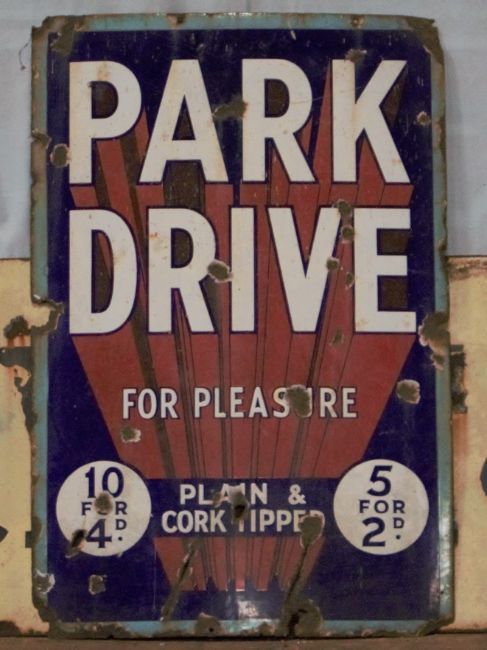 Vintage enamel advertising sign 'Park Drive for pleasure', 76 x 51cmPLEASE NOTE this lot is located at and will be sold from Cocknells Farm, Moreton Valence, Gloucester GL2 7LZ. Viewing is available on Tuesday 6th July 10am to 4pm and before the sale on Saturday 10th July from 9am to 11am, no appointment is necessary but we will limit numbers if required to ensure social distancing is observedWe are not able to offer our usual postage service for this lot