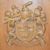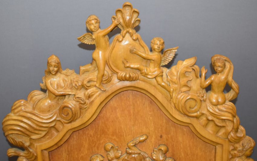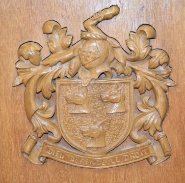 A figurally carved oak chair with armorial, W70 x H128cm