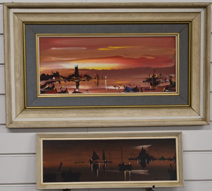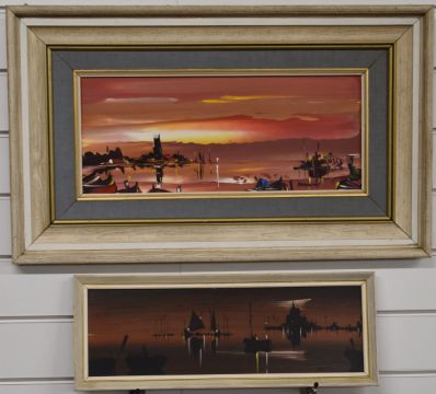 George Richard Deakins (1911-1982) oil on canvas coastal scene with boats at sunset and another similar by the same artist, both signed lower right, largest 18.5 x 45cm, both in part gilt and white painted frames