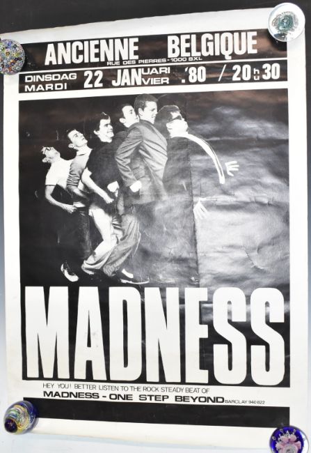 Three 1980s Madness posters to include Belgium, UK tours and a promotional example, 64 x 84cm
