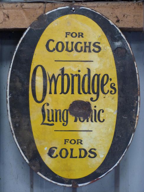 Vintage enamel advertising sign 'Owbridge's Lung Tonic for coughs, for colds', maximum diameter 57cm PLEASE NOTE this lot is located at and will be sold from Cocknells Farm, Moreton Valence, Gloucester GL2 7LZ. Viewing is available on Tuesday 6th July 10am to 4pm and before the sale on Saturday 10th July from 9am to 11am, no appointment is necessary but we will limit numbers if required to ensure social distancing is observedWe are not able to offer our usual postage service for this lot