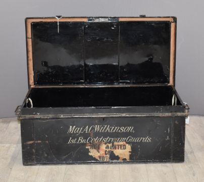 WW1 military metal trunk with 'Major A C Wilkinson 1st Battalion Coldstream Guards' stencilled to front, W77 x D39 x H28cm