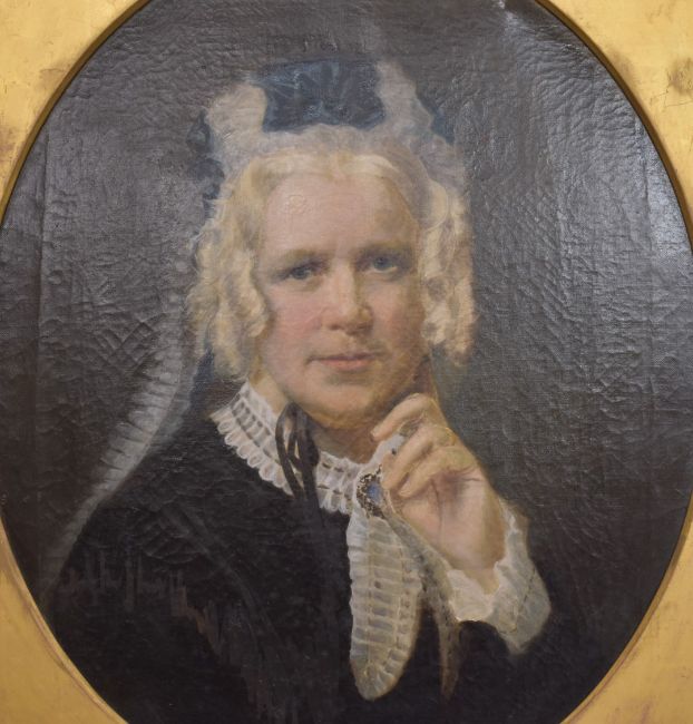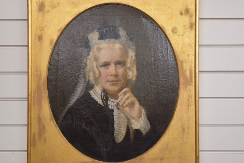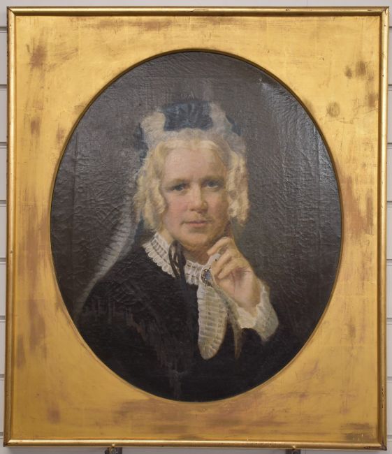 Victorian oil on canvas portrait of a lady wearing black, maximum diameter 60cm, in period gilt frame