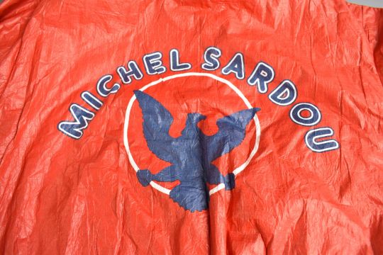 Two Michel Sardou concert jackets, one a navy and red waterproof hooded example, the other a satin crew jacket from the 1981-82 European Tour together with a promotional scarf