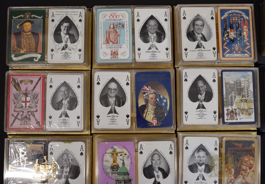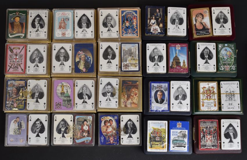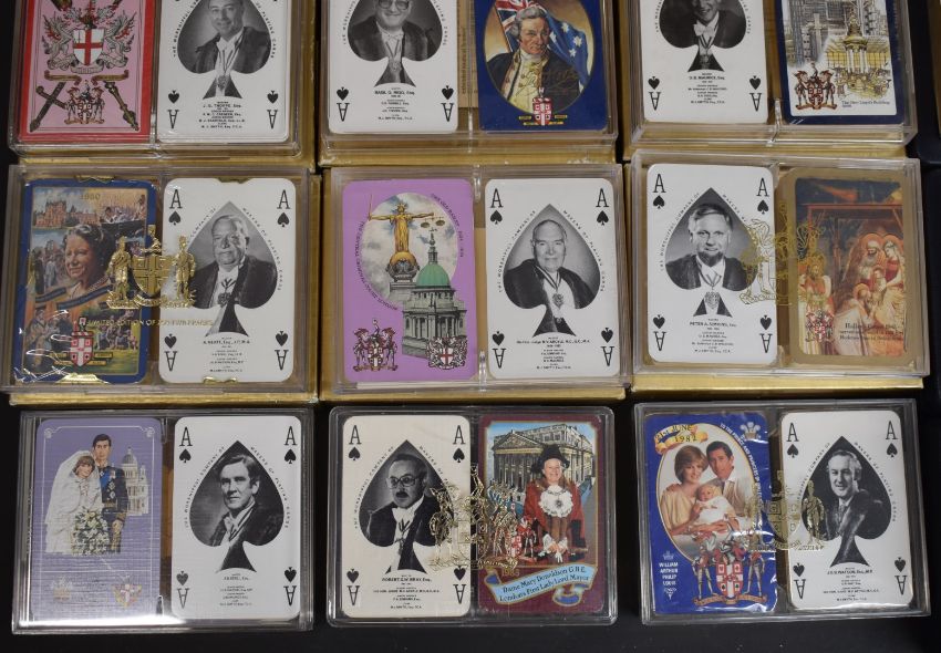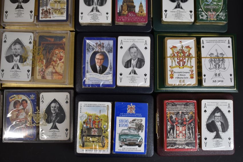 Forty packs of Worshipful Company of Makers of Playing Cards playing cards, comprising twenty double packs, 1980, 1981, 1982, 1983, 1984, 1985, 1986 Lloyds Building, 1987, 1988, 1989, 1990, 1991, 1992, 1994, 1995, 1996, 1997, 1998, 1999 balloon circumnavigation and 2000 millennium packs, all in original cases