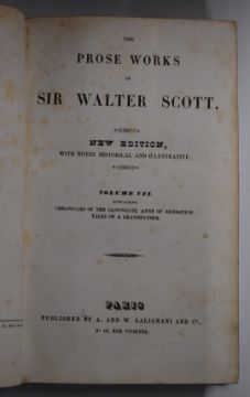 The Prose Works of Sir Walter Scott published Paris A & W Galignani (c.1830s) a New Edition with Notes Historical and Illustrative in 8 volumes, bound in half leather with raised bands and gilt lettered labels, marbling replaced on boards (lacking printed title page volume 1)
