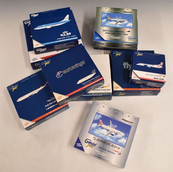 Ten Gemini Jets 1:400 and 1:200 scale diecast model aircraft, European carrier liveries including GJKLM467 KLM Boeing 737-300, GJLOG1116 British Airways Saab 340B, GJMON797 Monarch Airbus A330-200 and GJAFR1201 Air France Airbus A340-300, all in original boxes.