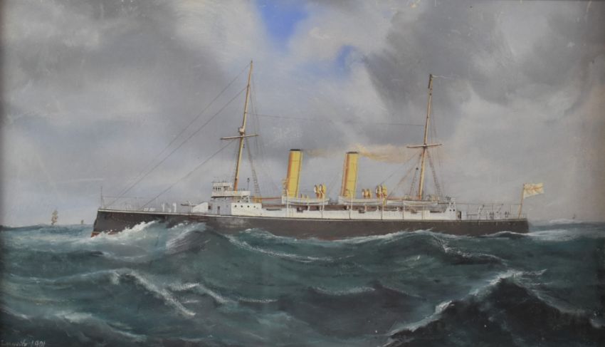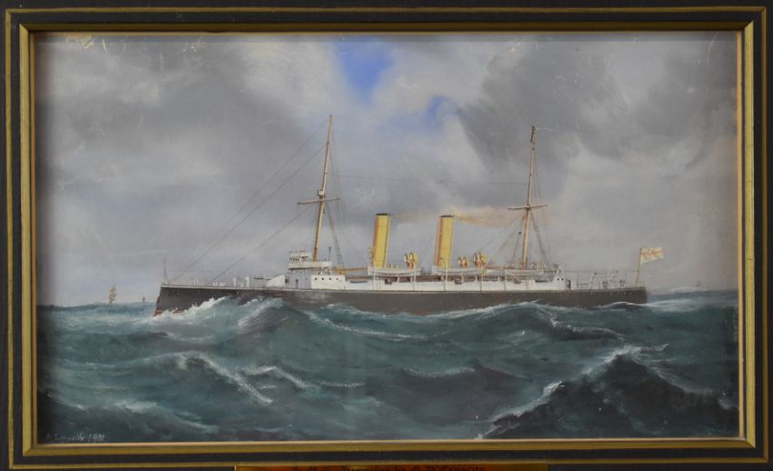 d'Esposito (Malta interest), maritime watercolour/gouache study H.M.S. Hermione, signed and dated lower 1901 lower left, 20 x 35cm, in gilt frame