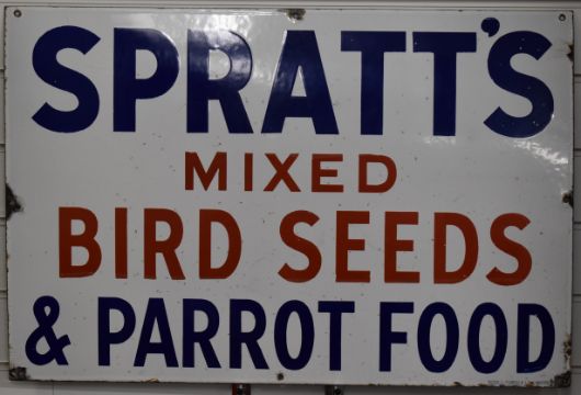 Vintage advertising sign 'Spratts Mixed Bird Seed and Parrot Food', 51 x 76cmPLEASE NOTE this lot is located at and will be sold from Cocknells Farm, Moreton Valence, Gloucester GL2 7LZ. Viewing is available on Tuesday 6th July 10am to 4pm and before the sale on Saturday 10th July from 9am to 11am, no appointment is necessary but we will limit numbers if required to ensure social distancing is observedWe are not able to offer our usual postage service for this lot