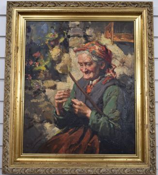 Impressionist oil on canvas old lady spinning yarn, indistinct signed lower left, possibly G Maddnini, 60 x 50cm, in gilt frame