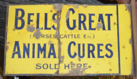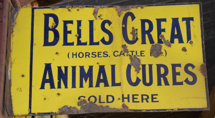 Vintage enamel double sided advertising sign 'Bell's Great Animal Cures', 30.5 x 51cm