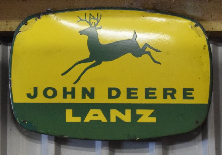 Vintage enamel advertising sign 'John Deere Lanz', 38 x 57cmPLEASE NOTE this lot is located at and will be sold from Cocknells Farm, Moreton Valence, Gloucester GL2 7LZ. Viewing is available on Tuesday 6th July 10am to 4pm and before the sale on Saturday 10th July from 9am to 11am, no appointment is necessary but we will limit numbers if required to ensure social distancing is observedWe are not able to offer our usual postage service for this lot