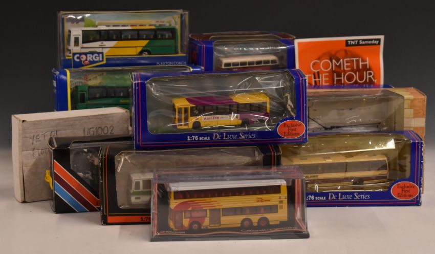 Twenty-eight public transport and commercial 1:76 scale diecast model vehicles by Corgi, Matchbox, Lledo etc, including Plaxton Pointer Dennis Dart Thamesway, Leeds Transport Tram Yorkshire Post and Badgerline Plaxton Coach, all in original boxes.