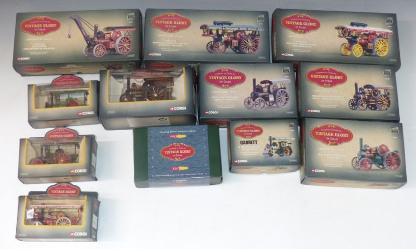 Fifteen Corgi Vintage Glory of Steam 1:50 scale diecast model vehicles including 80801 Fowler B6 Showmans Locomotive 'The Lion', 80109 Fowler B6 Road Engine 'Lafayette' and 80104 Fowler B6 Road Locomotive 'Atlas', all in original boxes.