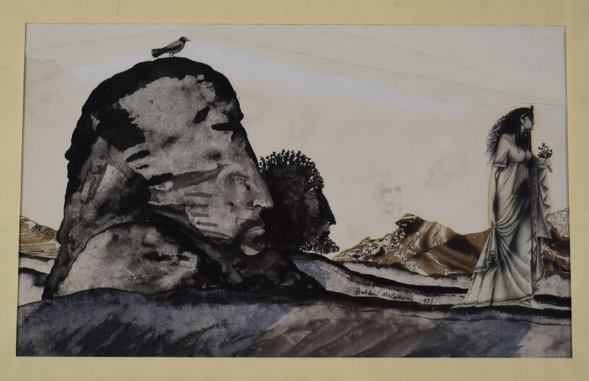 Graham McCallum (screenwriter, illustrator and designer) watercolour of Hades looking at Persephone, signed and dated 1973, 24 x 39cm, in clip frame