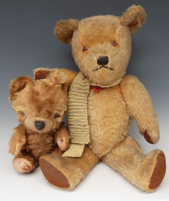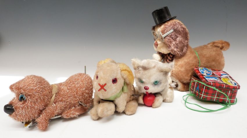 Six vintage Teddy bears including a blonde mohair example with clockwork musical box playing Little Donkey, remote controlled dog with top hat, clockwork rabbit and cat etc, largest 42cm tall.