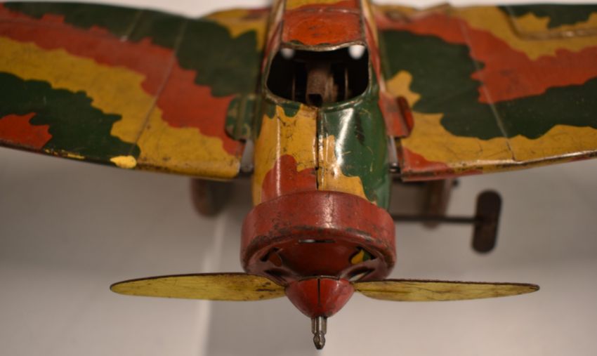 Mettoy tinplate clockwork model aeroplane with sparking cockpit gun and folding wings.